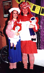 Two months after I was born on Halloween 1971 my dad carved a pumpkin, as he does every year, and apparently, I became the decoration on the top! Fast forward in time to Halloween 1999 when I was 28 years old. Here is a picture of Jacques and myself all “dolled” up for a Halloween party at our dance studio. I had found some Raggedy Anne and Andy dolls in the closet and we though it would be funny to use them as part of our costumes for Halloween. Only we took it a step further than that! Can you tell which one is Elizabeth and which one is Jacques?